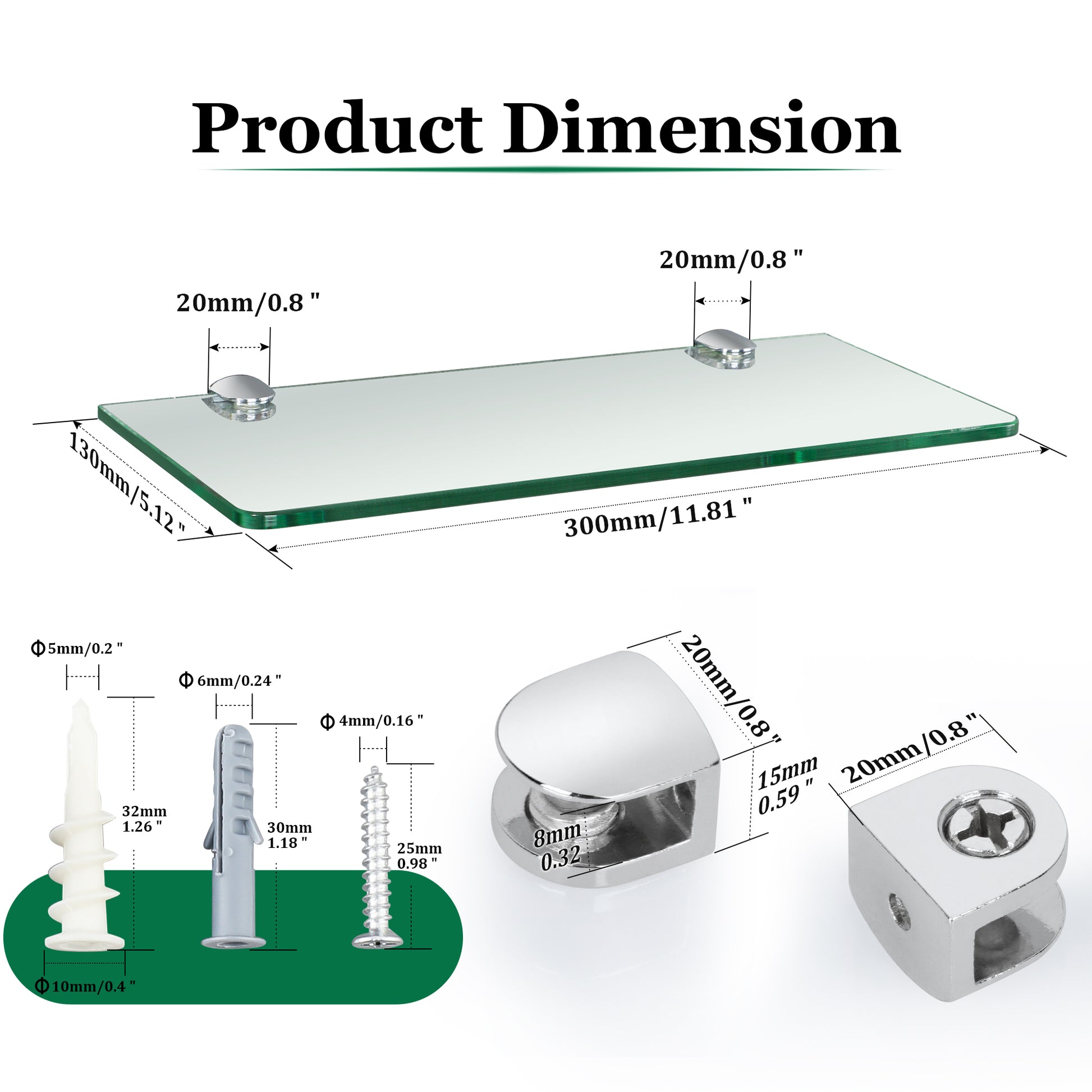 - DIMENSION- 300MM * 130MM * 6MM for shelf, 20MM * 20MM * 15MM for bracket. Package content : 2x glass shelf, 4x brackets, 4x drywall anchors, 4x brick & concreteanchors and 4x screws.