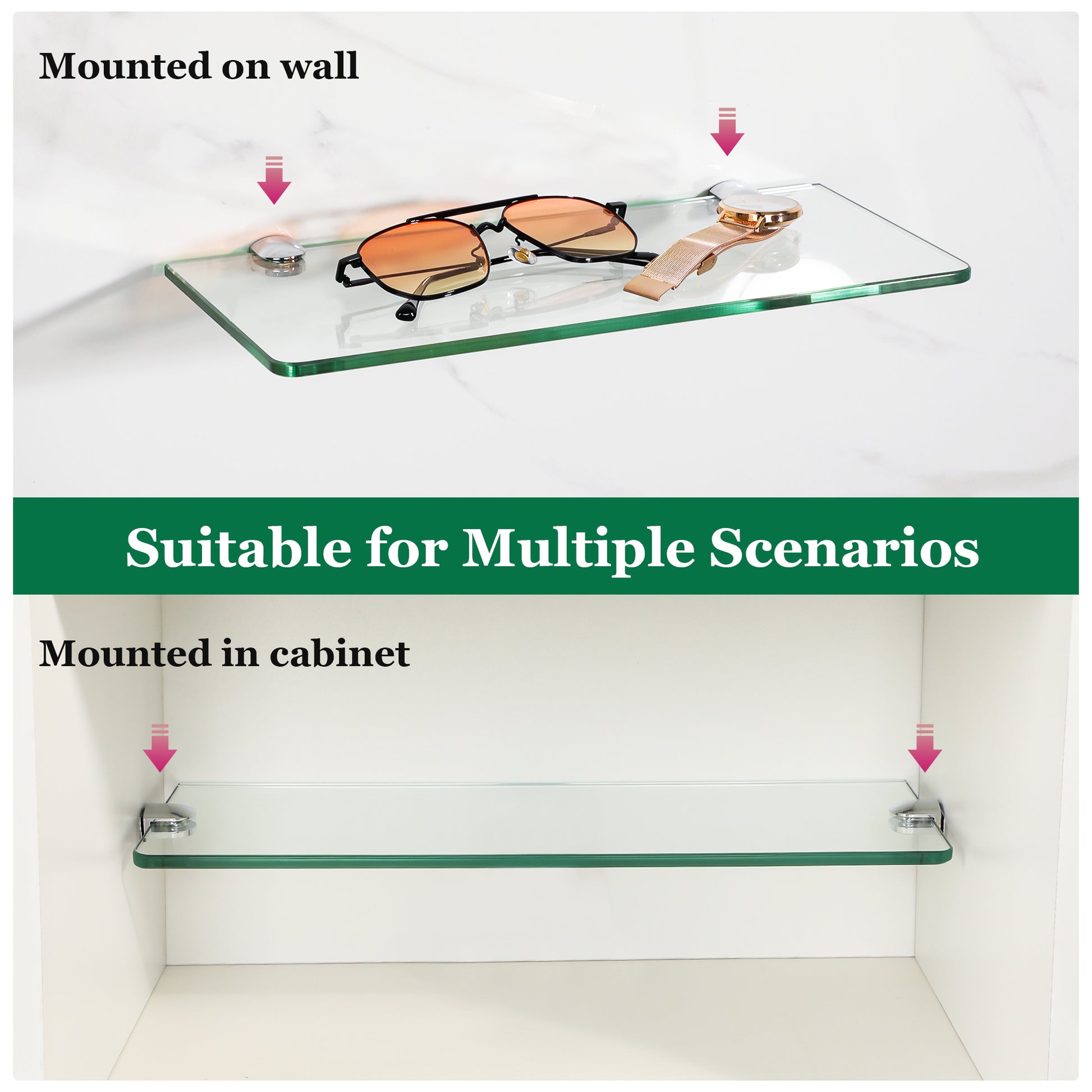 - TWO-LAYER STRUCTURE FOR SPACE SAVING- You can mount the glass shelves on the wall or in the cabinet according to your needs, flexible and effective use of narrow space. Also can use it to decorate your living room, office, parlour, showroom, wine cooler, bathroom, etc.