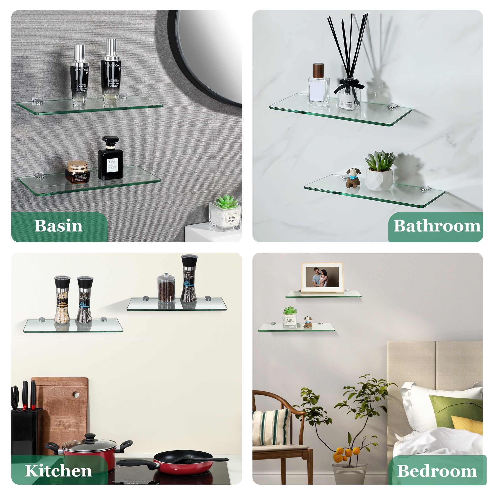- MINIMALIST DESIGN- No fussy border, neat and elegant appearance to stand out in any surrounding. Everything looks clear on the glass shelf. You can place shampoo, alarm clock, books, photos, aroma and other decorations to organize your home space.