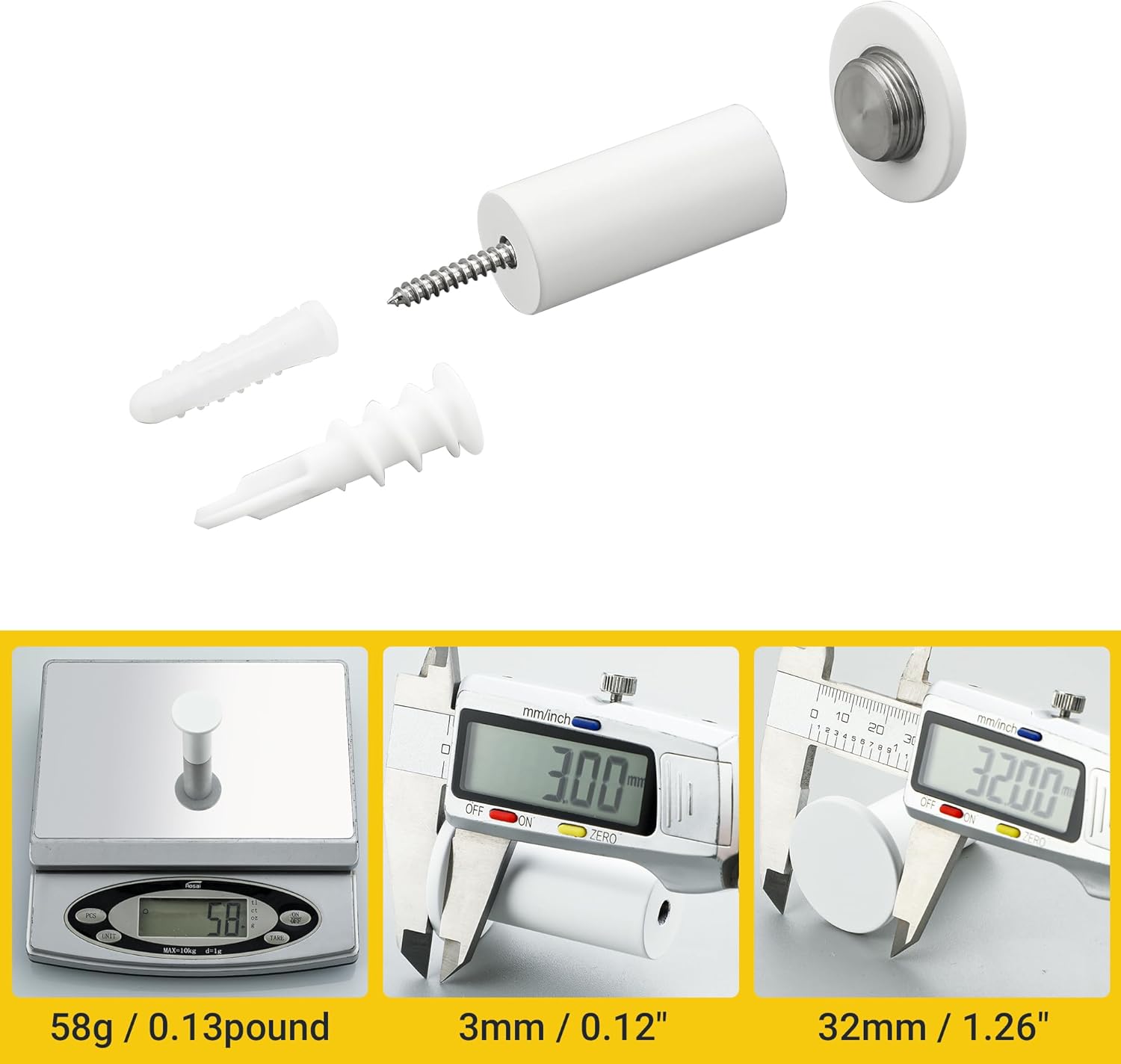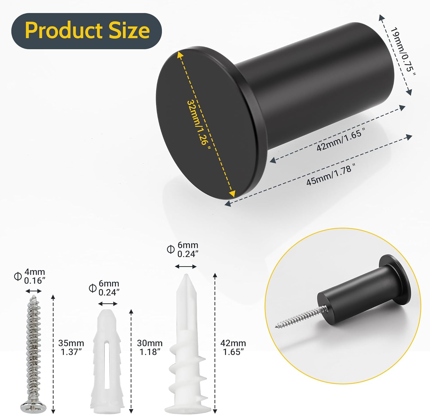 Material Stainless Steel Diameter of surface 32MM Diameter of column 32MM Height 45MM Finish type Painted Installation type Wall Mount Shape Round Max. Load 15kg/ 33lbs *Please check the size before purchasing.